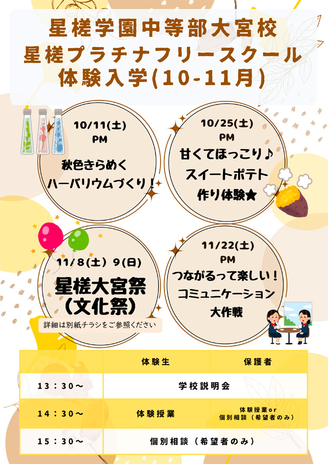 | 10月11日 土曜日 | 【午後の部】 13:30~ 学校説明会 14:30~ ・体験生/体験授業 秋色きらめくハーバリウムづくり! ・保護者/体験授業or個別相談(希望者のみ) 15:30~ 個別相談(希望者のみ) |