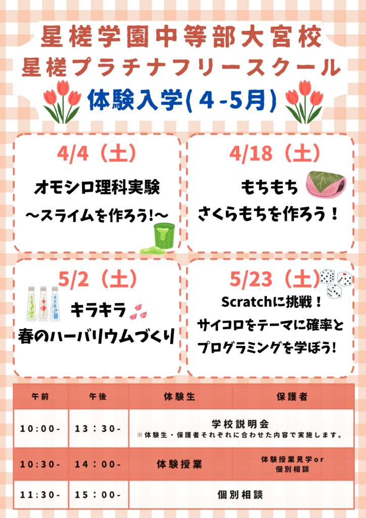 4・5月の中等部・フリースクールの体験入学についてお知らせします。